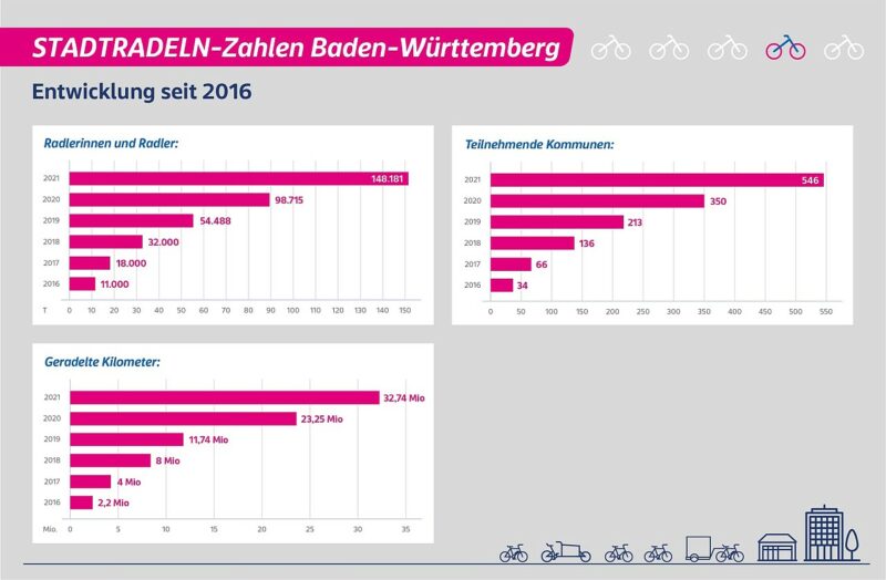 Die Begeisterung für Stadtradeln ist auch in diesem Jahr ungebrochen. In Baden-Württemberg nahmen 148.181 Menschen teil. Das sind 50% mehr als im Jahr 2020. Auch die 546 Kommunen (+56%) stellen einen neuen Rekord auf. Im Bundesvergleich kamen dieses Jahr die meisten teilnehmenden Kommunen aus Baden-Württemberg. Mit den 32,75 Millionen Kilometern (+46%) konnten die hiesigen Radlerinnen und Radler 4.812 Tonnen CO2 einsparen (+42% im Vergleich zu 2020). Somit hat im Schnitt jeder Einwohner Baden-Württembergs 2,95 Kilometer zum Ergebnis beigetragen, was deutschlandweit zum 1. Platz führt.