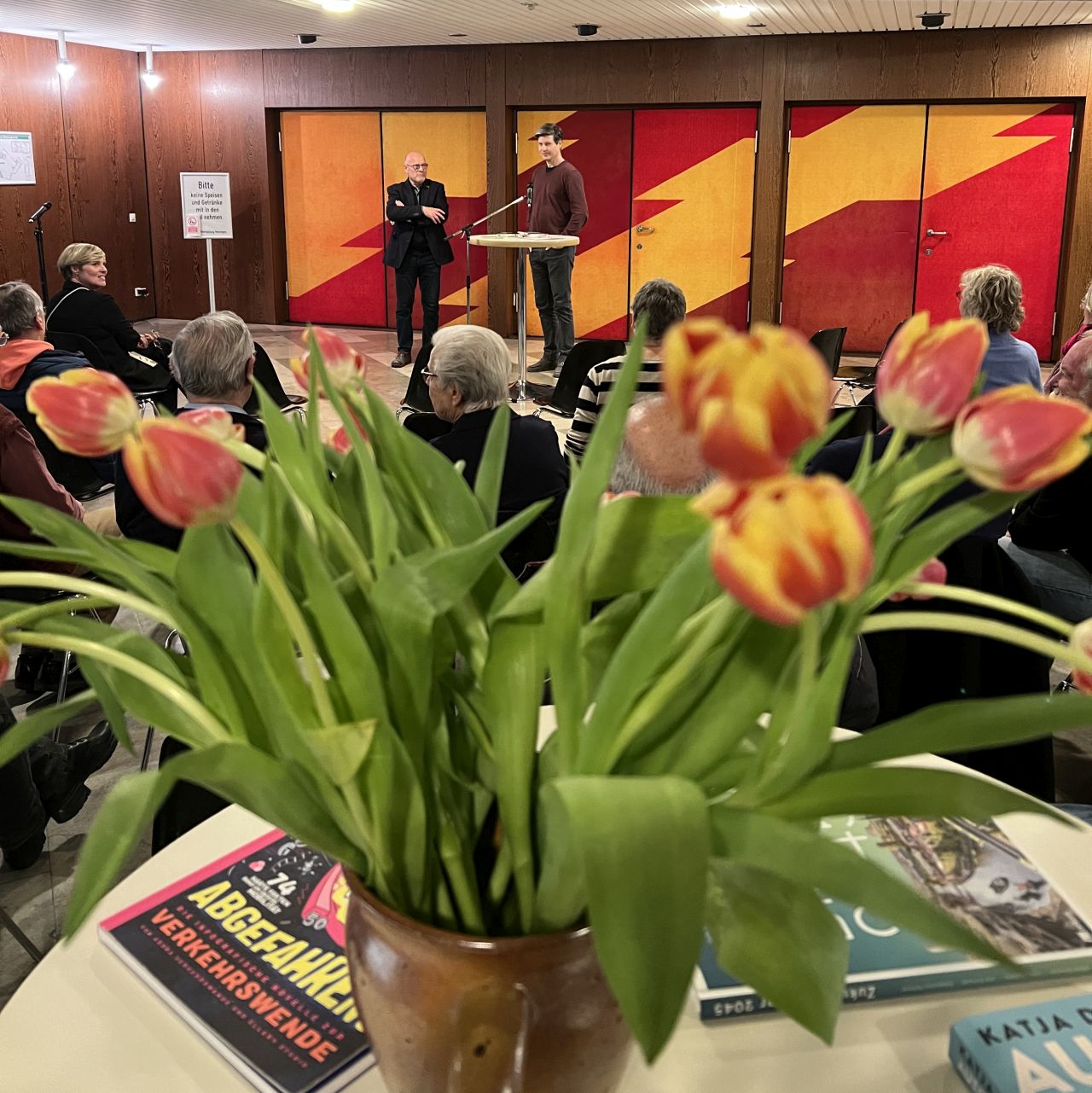 Am Abend las Winfried Hermann dann in der Stadthalle aus seinem Buch „Und alles bleibt anders: Meine kleine Geschichte der Mobilität“. Dr. Markus Schenk vom Ortsverband der Grünen in Metzingen war Moderator der Lesung. Die Gäste wollten vor allem etwas über den Bahnverkehr, Fußverkehr und speziell S21 erfahren. Und so erfuhren die Zuhörenden, wann Deutschland mal Bahnland war, unter welchen Bedingungen S21 damals entstand, was es mit der Sprechklausel auf sich hat und wie sich Winfried Hermann seine persönliche Mobilität im Jahre 2051 vorstellt.