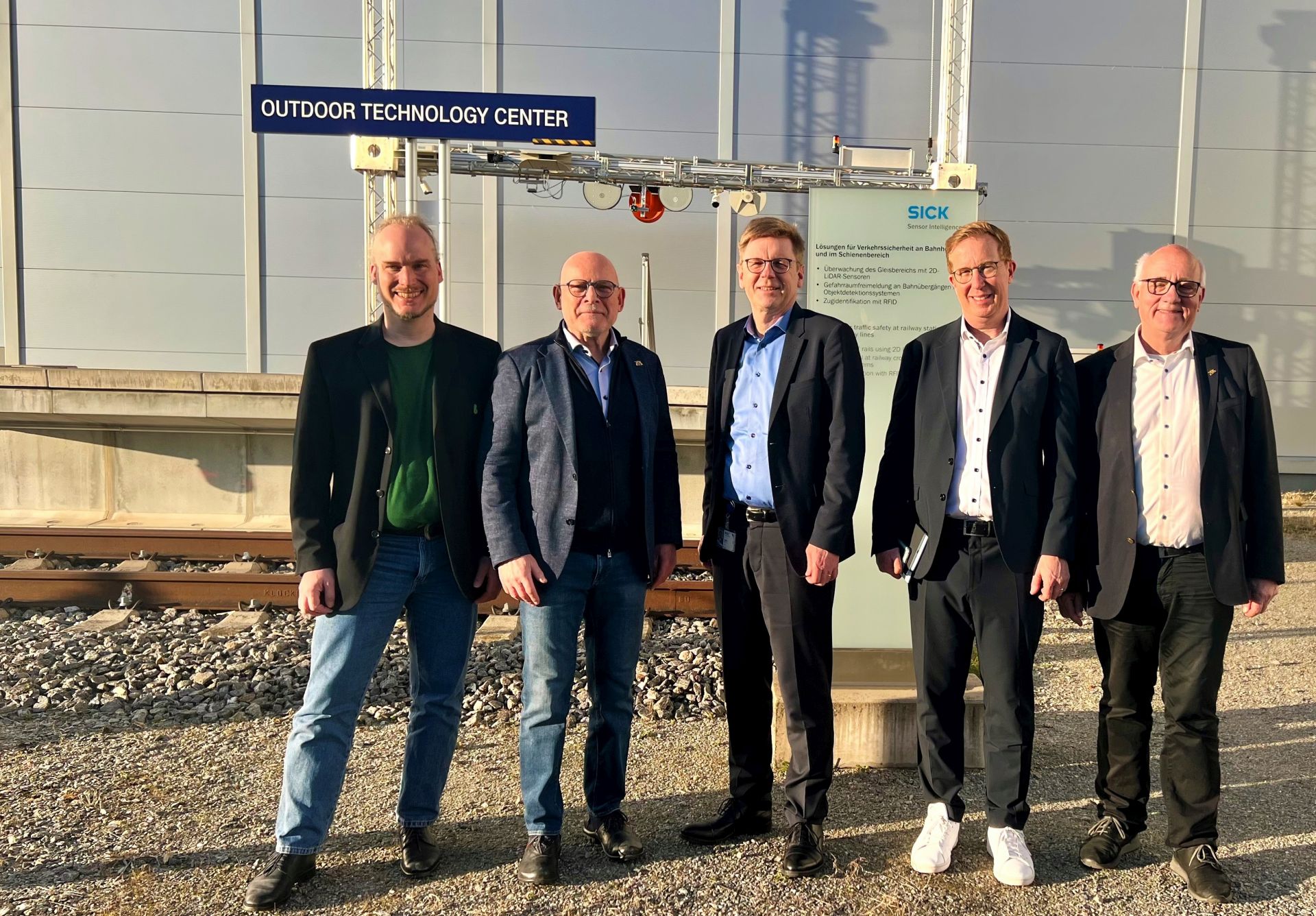 Wie die von SICK entwickelte Sensortechnologie eingesetzt werden kann, wurde anschließend auf dem firmeneigenen Outdoor-Testgelände beim Logistikzentrum in Buchholz demonstriert. Dazu gehören fest installierte Sensoren, die Hindernisse auf Schienen erkennen und 3D-Kameras, die in Hochgeschwindigkeit vorbeifahrende Züge auf Qualitätsdefekte untersuchen können oder komplexe Sensorsysteme, die LKW vor der Tunneleinfahrt auf zu hohe Temperaturen überprüfen können. Minister Hermann zeigte sich beeindruckt von der SICK AG: „Nicht nur entwickelt und produziert die SICK AG hochkomplexe und wichtige Produkte, sie legt dabei auch Wert, auf eine beispielhafte Unternehmenskultur, die ihre Mitarbeiterinnen und Mitarbeiter schätzt und schon früh Nachhaltigkeitsstrategien in allen Bereichen entwickelt und umgesetzt hat.“