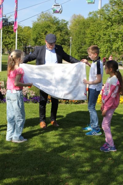 Am Rande der Bundesgartenschau überreichten Schülerinnen und Schüler der Rheingaugrundschule Mannheim ihre Forderungen nach einer Schulstraße an Minister Winfried Hermann. An dieser Schule wurde vom 18.-21. April ein temporäres Durchfahrtsverbot für KfZ zu Beginn und am Ende des Schultages im Umfeld des Schulgebäudes nach Wiener Vorbild getestet. Dieses gemeinsame Projekt der Schulleitung, des Elternbeirats, des Quartiermanagements und der Kidical Mass fand nicht nur bei den Schülerinnen und Schülern großen Anklang.