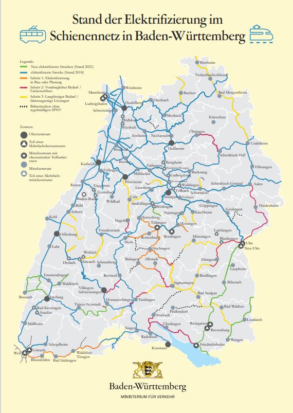 Momentan sind 71% der Eisenbahnstrecken in Baden-Württemberg elektrifiziert, damit sind wir weit über dem bundesdeutschen Schnitt von ca. 60%. Auf vielen Strecken lohnt es sich über die kommenden fünf bis zehn Jahre Oberleitungen auszubauen, Netzlücken zu schließen und somit auf ca. 80% Elektrifizierung zu kommen.