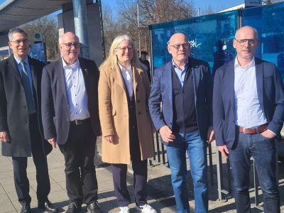 Auf dem Foto: die Konzernbevollmächtigte der DB AG, Dr. Clarissa Freundorfer, der Baden-Württembergische Verkehrsminister Winfried Hermann, Hanno Hurth als Vorsitzender des Zweckverbandes Regio-Nahverkehr-Freiburg (ZRF), Rolf Band vom Bahnhofsmanagement Freiburg und der Wahlkreisabgeordnete Alexander Schoch.
