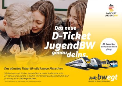 Seit dem 1. Dezember hat das JugendticketBW einen neuen Namen: D-Ticket JugendBW. Hinter den neuen Namen steckt auch ein verbessertes Angebot. Das Ticket löste am 1. Dezember das JugendticketBW ab. Für 365 Euro im Jahr können junge Menschen nun in ganz Deutschland mit Bus und Bahn fahren. Verkehrsminister Winfried Hermann sagte über das D-Ticket JugendBW: „Unser neues Angebot verbindet die Vorteile des preisgünstigen JugendticketBW mit der bundesweiten Reichweite des Deutschland-Tickets. Für nur einen Euro pro Tag können junge Menschen aus Baden-Württemberg ab 1. Dezember in ganz Deutschland mit Bund und Bahn unterwegs sein. Das Ticket entlastet sie und ihre Familien nicht nur finanziell. Es leistet auch einen wichtigen Beitrag für den Klimaschutz. Denn ich bin überzeugt: Wer als junger Mensch mit dem öffentlichen Personenverkehr unterwegs ist, wird sich ein Leben lang klimafreundlich und verantwortungsvoll fortbewegen.“ Mehr Informationen >> hier!