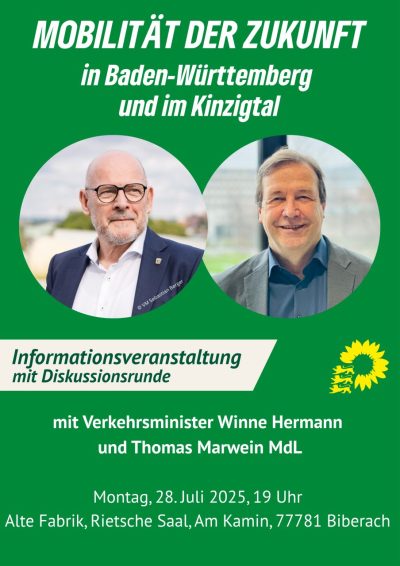 Öffentliche Abendveranstaltung: Verkehrsminister Winne Hermann MdL zum Thema Mobilität der Zukunft – in Baden-Württemberg und im Kinzigtal – mit Thomas Marwein MdL