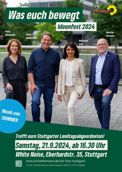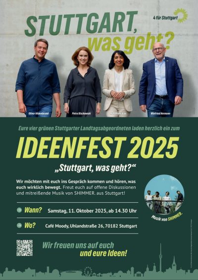 Wir ‚4 für Stuttgart‘ – eure grünen Landtagsabgeordneten – laden euch herzlich zum Ideenfest ein. Unter dem Motto „Was euch bewegt“ möchten wir mit euch ins Gespräch kommen und hören, was euch wichtig ist.