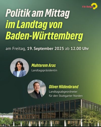 Die vier Stuttgarter Landtagsabgeordneten Muhterem Aras, Winfried Hermann, Oliver Hildenbrand und Petra Olschowski haben gemeinsam das Veranstaltungsformat „Politik am Mittag“ entwickelt. Die Idee: Politik soll dort stattfinden, wo sie wirkt – in Stuttgart, mitten im Alltag. Die neue Reihe bringt politische Gespräche an verschiedene Orte in der Stadt – offen, nahbar und in der Mittagspause.