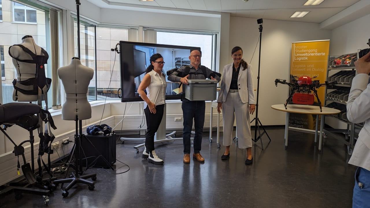 Im Rahmen seiner Sommertour besuchte Winne Hermann den Lehrstuhl für Logistik der technischen Hochschule Stuttgart. Nach der Begrüßung durch die Hochschulleiterin, Rektorin Prof. Dr. Katja Rade und einer Kurzvorstellung der Hochschule für Technik Stuttgart und Master-Studiengang Umweltorientierte Logistik, erfuhr er – auch als Testperson – wie moderne Logistik künftig funktionieren könnte.